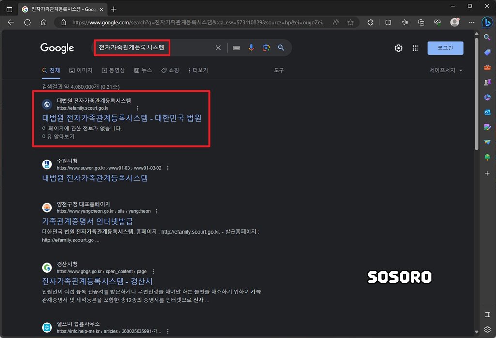 자주 사용하는 포털 사이트에 [전자가족관계등록시스템]을 검색해 줍니다. 검색을 하신 다음에 공식 홈페이지를 클릭해 들어가 주세요.