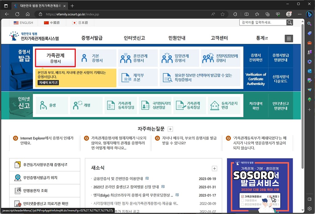 홈페이지에 들어가시면 중앙에 [증명서 발급]이 있습니다. 이 중에서 [가족관계 증명서]를 클릭해 주세요.