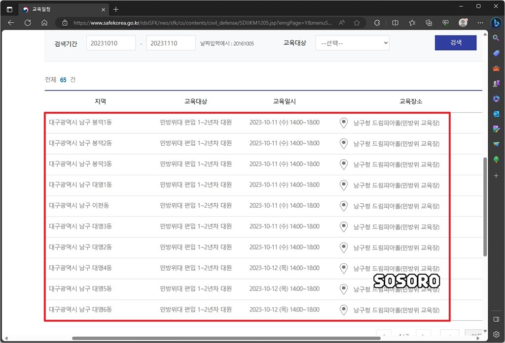 조회를 하시면 이렇게 어느 지역에, 어떤 동에, 몇 년 차 대원이 교육을 받을 수 있는지 날짜와 시간이 나옵니다. 교육 장소도 나오니 어디로 가야 하지? 따로 알아보지 않으셔도 됩니다.