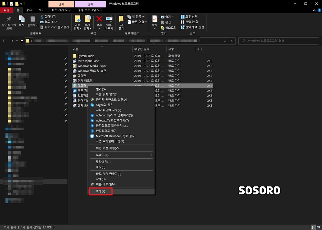 파일 위치 열기를 클릭하시면 메모장 프로그램 아이콘이 나옵니다. 이 메모장을 마우스 우 클릭하신 다음에 [속성]을 클릭해 주세요.