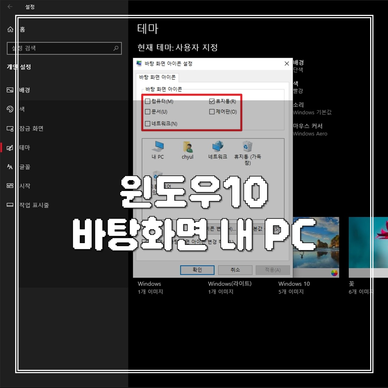 여기서 바탕화면에서 사용했으면 좋겠다 하는 아이콘을 체크해 주시고 [확인]을 눌러 주시면 됩니다. 저는 [컴퓨터]를 체크하고 확인을 눌러볼게요.