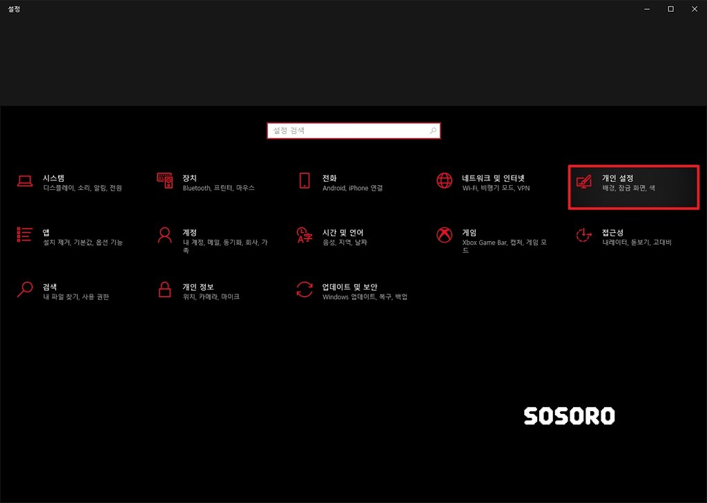 윈도우 설정으로 들어가신 다음에 [개인 설정]을 클릭해 주세요.