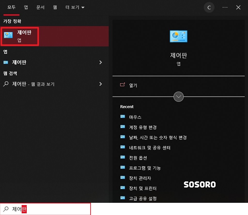 먼저 윈도우 검색 상자에 [제어판]을 검색해 줍니다. 제어판을 검색하신 후 제어판 앱을 실행시켜 주세요.