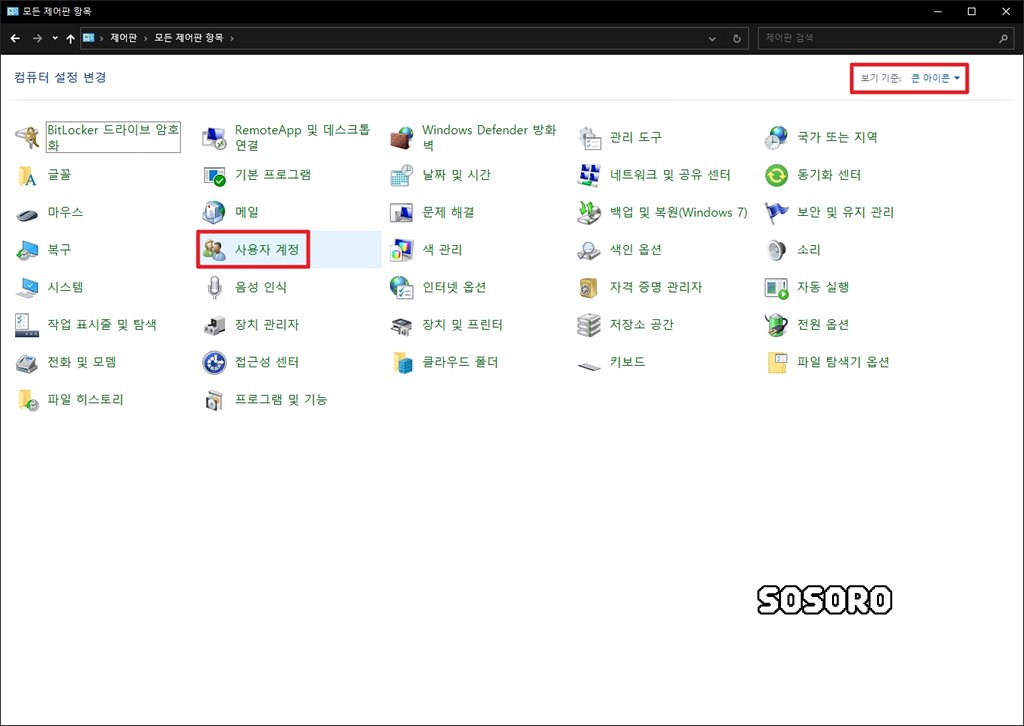 제어판으로 들어가셨으면 우측 상단에 "보기 기준"을 [큰 아이콘]으로 변경을 해 주신 다음에 [사용자 계정] 항목을 클릭해 줍니다.