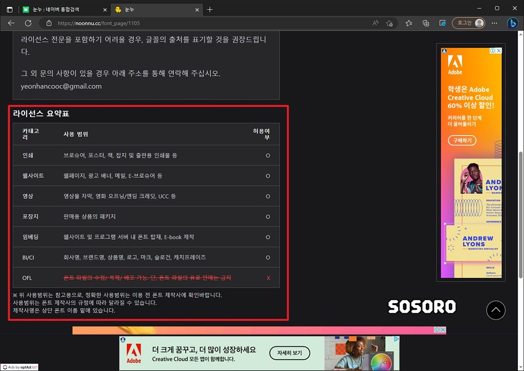 모든 폰트에 보시면 이렇게 라이선스 요약표가 있습니다. 카테고리, 인쇄, 웹사이트, 영상, 포장지, 임베딩 등 여러 가지 항목이 있는데요. 본인이 사용하려고 하는 목적을 확인해서 다운로드하여 사용하시면 됩니다.