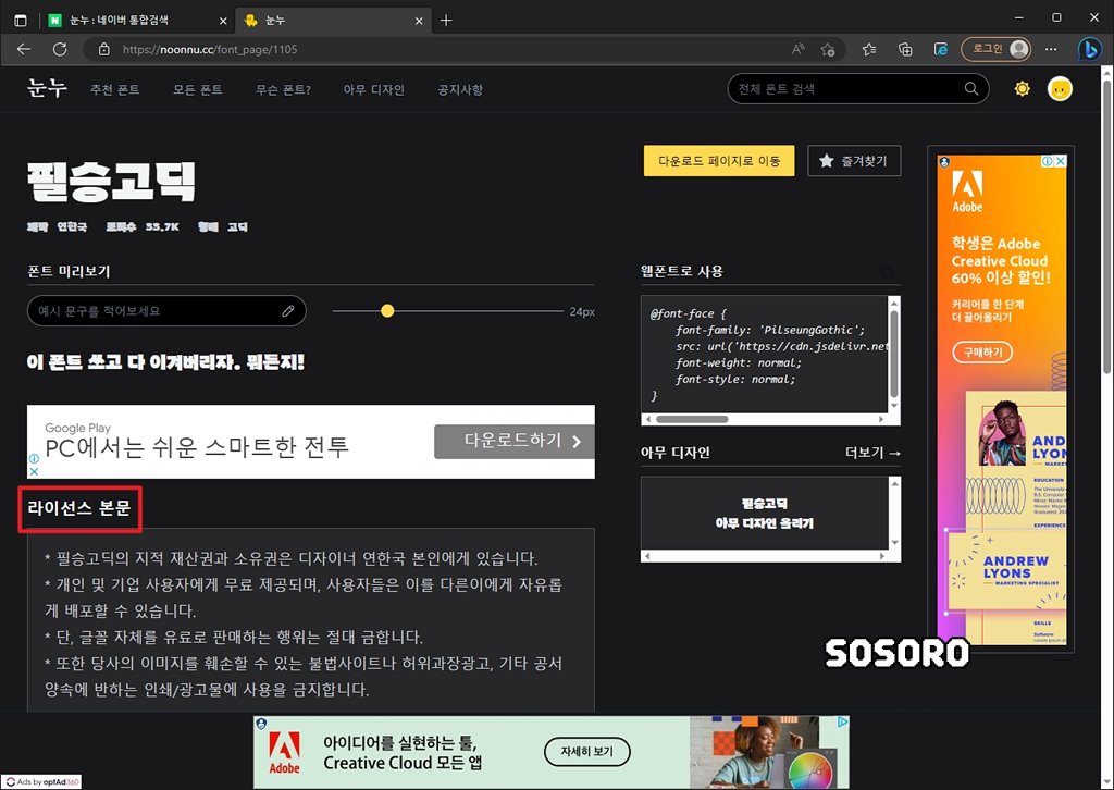 저는 예시로 [필승 고딕]이라는 폰트를 선택해 봤습니다. 폰트 선택이 중요한 것이 아니고 라이선스를 잘 확인하셔야 해요.