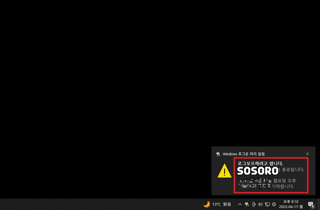 위에 명령어를 입력하면 오른쪽 하단에 [로그오프 하려고 합니다.]라는 문구가 나오면서 몇 분 후에 종료가 되는지 안내가 나와요.