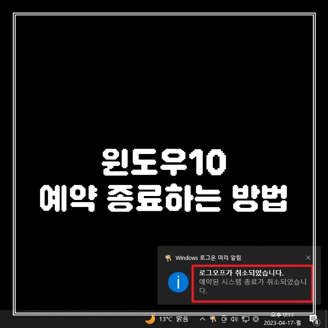 혹시나 시간을 잘못 계산해서 잘못 입력을 했을 때는 취소도 가능합니다. 검색 상자에 [shutdown -a]를 입력하시면 로그오프가 취소되었다는 문구가 나오면서 예약 종료했던 것이 취소가 됩니다.
