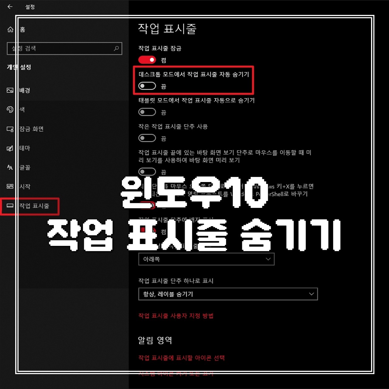 개인 설정으로 들어가시면 [작업 표시줄] 탭이 있습니다. 작업 표시줄 탭을 클릭해 주시고, 작업 표시줄 메뉴에서 [데스크톱 모드에서 작업 표시줄 자동 숨기기]를 체크해 주시면 됩니다.