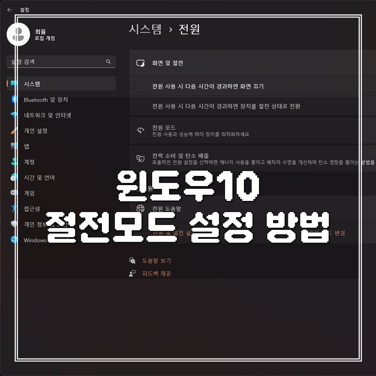 시스템으로 들어가시면 [전원 및 절전] 탭이 있습니다. 전원 및 절전 탭을 클릭해 주시고, 절전 모드를 설정해 주시면 됩니다.
