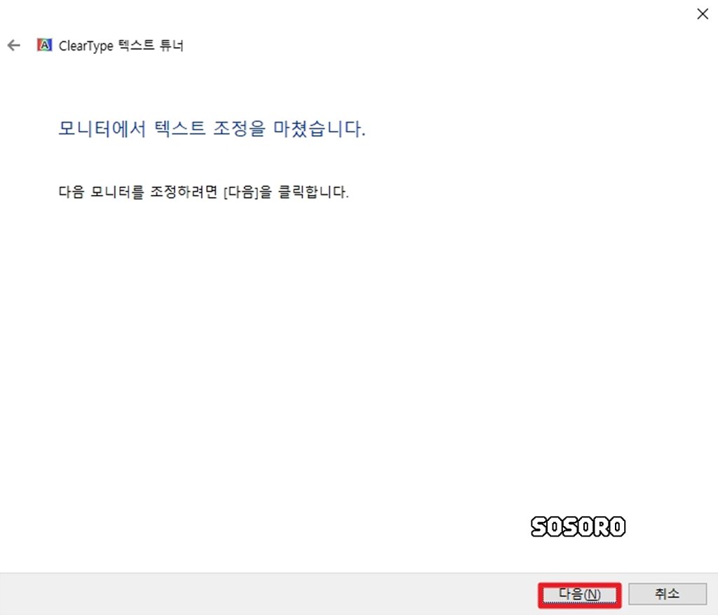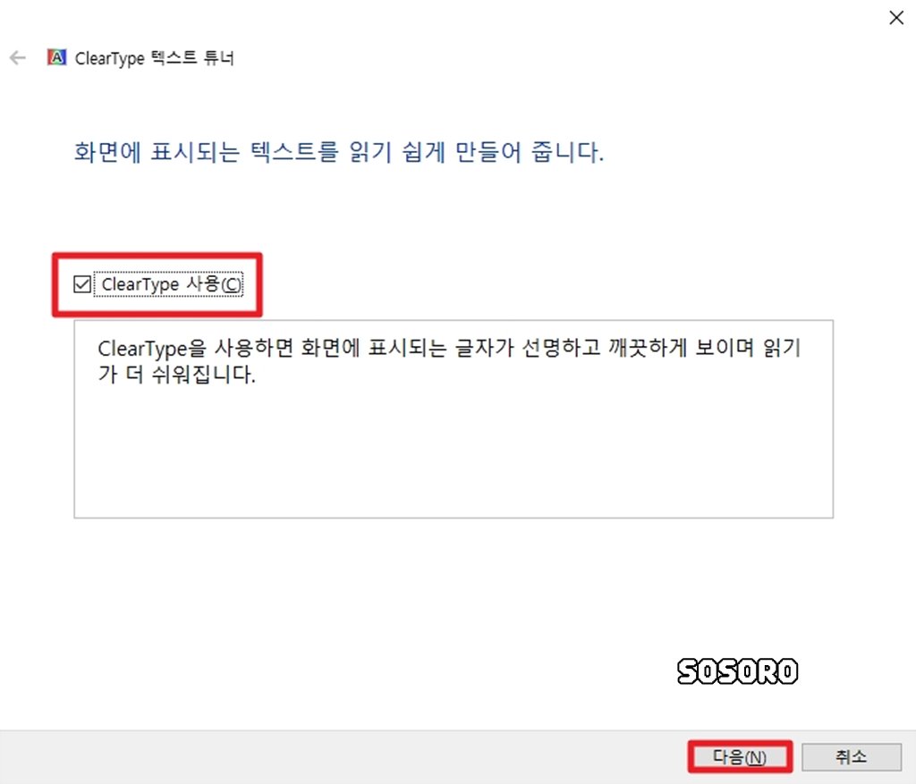 [ClearType 사용]을 체크해 주시고 [다음] 버튼을 클릭해 다음으로 넘어가 줍니다.