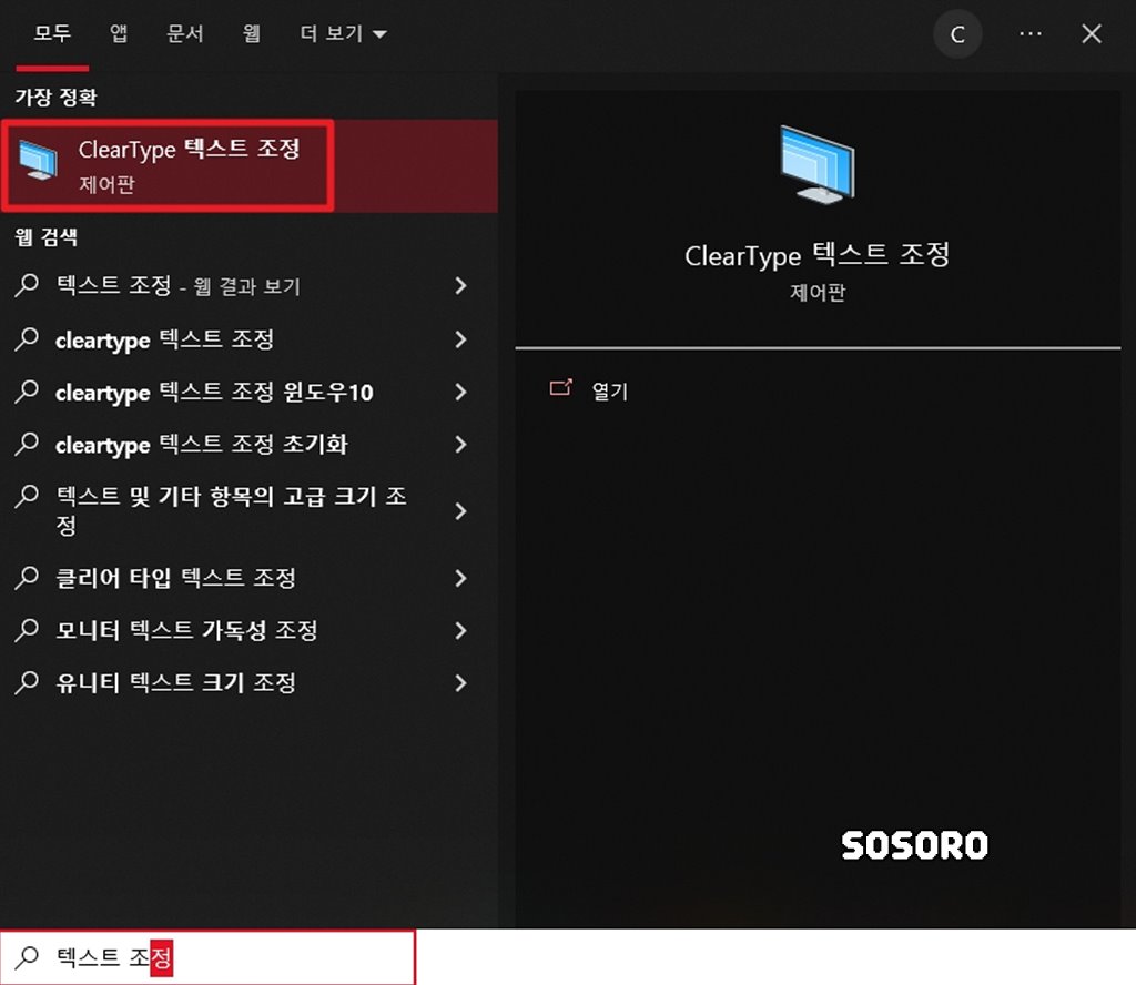 윈도우 검색 상자에 [텍스트 조정]이라고 검색을 해 주세요. 검색을 하시면 [ClearType 텍스트 조정]이 나옵니다. 클릭하셔서 실행해 주세요.