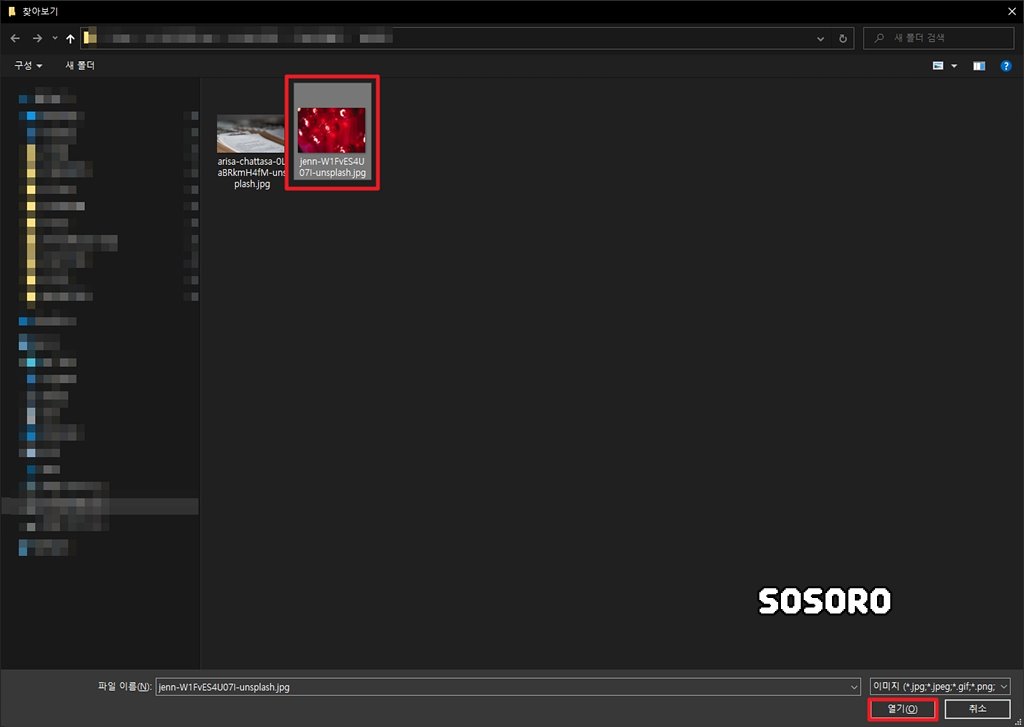 파일 선택을 하시면 이렇게 폴더 안에 있는 이미지 리스트가 쭉 나옵니다. 여기서 대표로 지정할 이미지를 선택해 주시고, [열기]를 클릭해 주시면 됩니다.