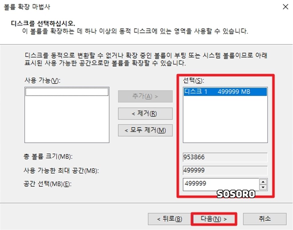 볼륨 확장 마법사에서 남은 용량의 디스크가 나옵니다. 이 남은 용량 모두 체크하셔서 [다음]을 클릭해 주세요.