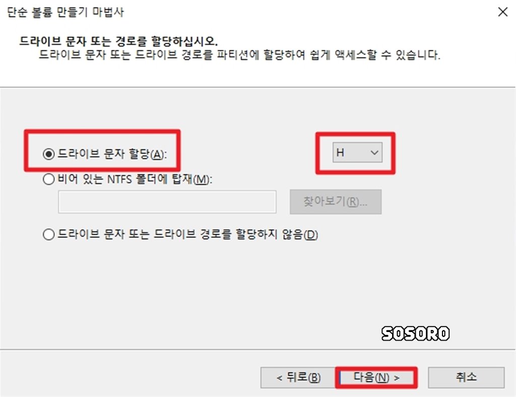 이번에는 드라이브 문자 할당을 해주어야 합니다. C, D, E, F, G, H 순으로 지정이 됩니다. 원하는 문자 할당 값이 있으면 변경해 주시고, 없으면 [다음]을 클릭해 주세요.