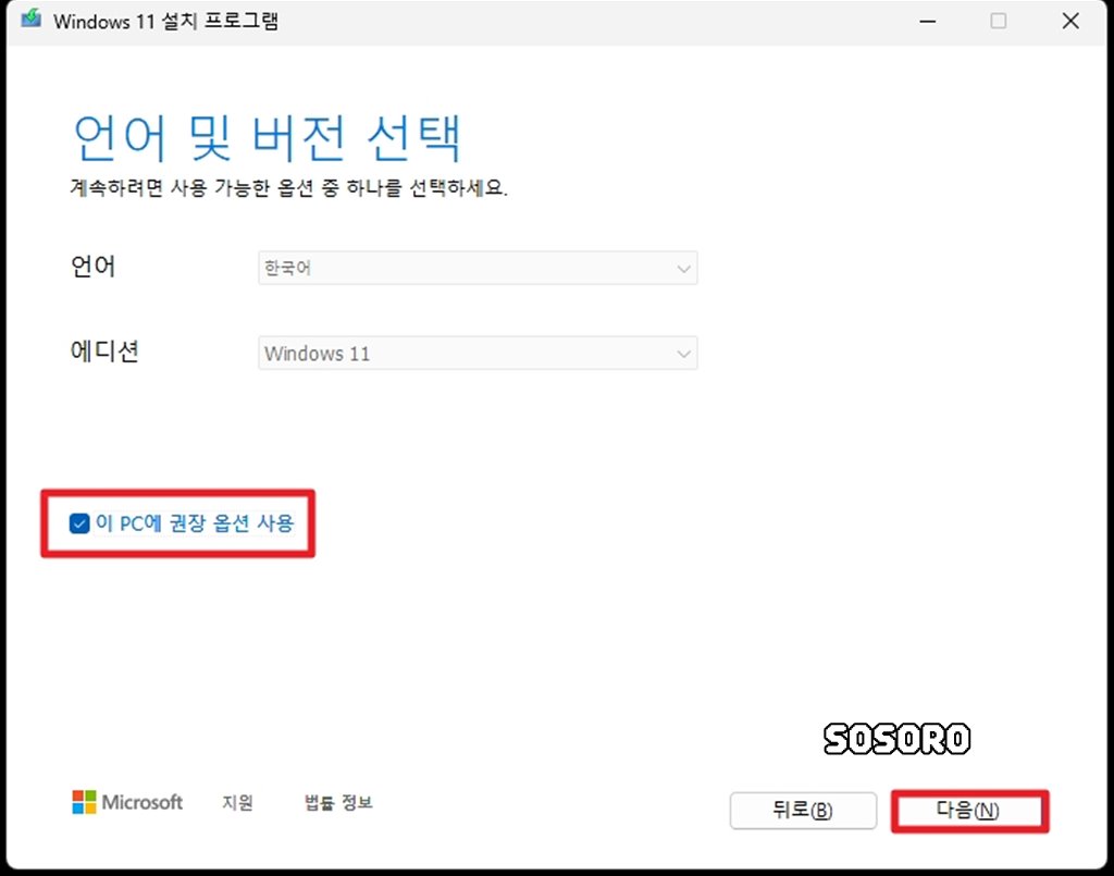 사용할 언어와 에디션을 선택해 줍니다. 아래에 있는 [이 PC에 권장 옵션 사용]을 체크해 주시고, [다음]을 클릭해 주세요.